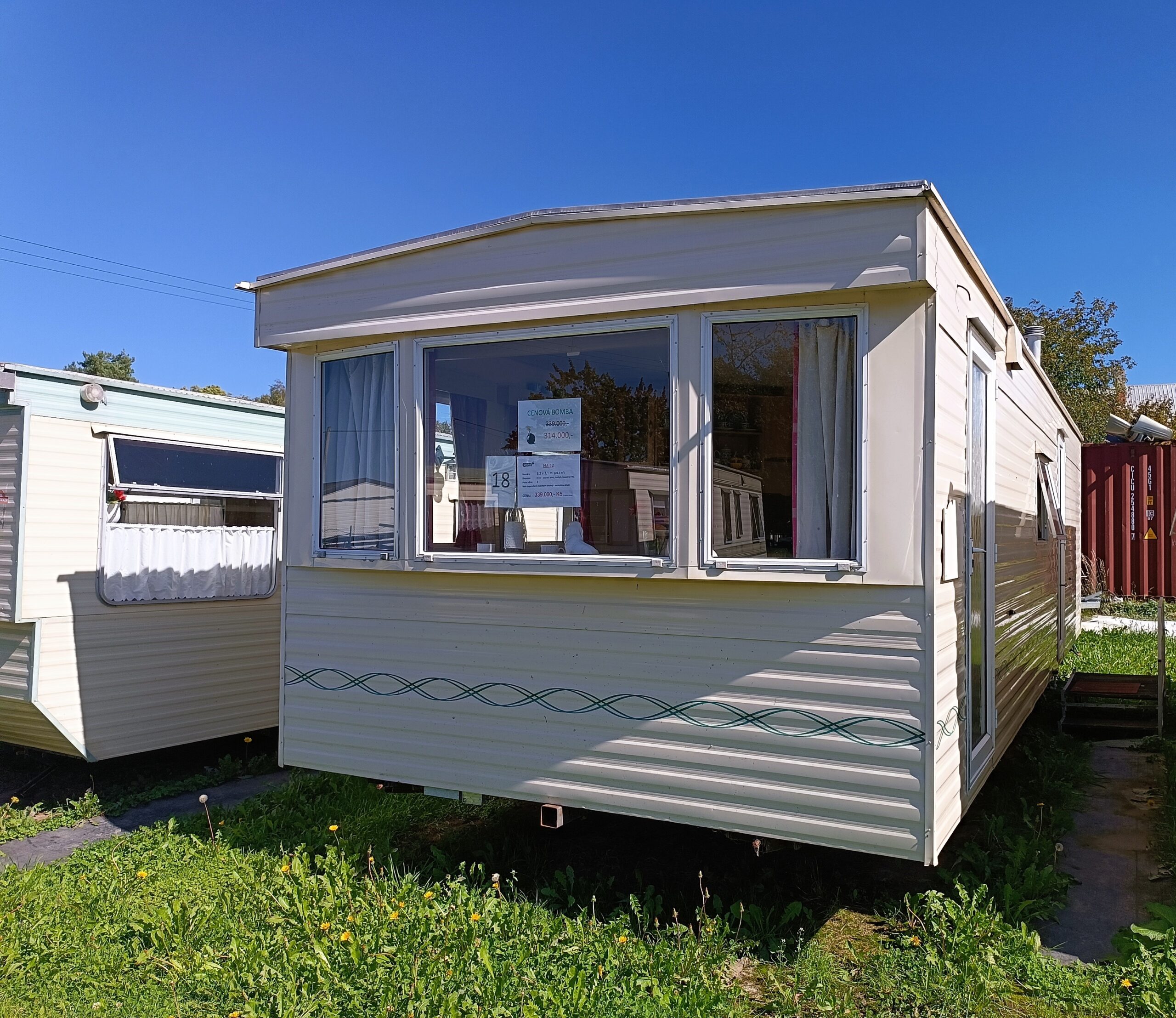 Krásný mobilní domek se dvěma vchody a jednoduchými skly v plastovém rámu, který lze využívat k sezónní rekreaci na zahrádce. V celém domku je podlaha pokrytá linoleem. Prostorný obývací pokoj je vybavený vestavnou sedací soupravou s úložným prostorem pod sezením, dvěma kulatými židličkami a kulatým jídelním stolem. Zajímavě řešená kuchyňská linka je vybavená plynovým sporákem s dvěma menšími troubami, menší lednici a dřezem. V ložnici se nachází manželská postel a velká šatní skříň s kosmetickým stolkem, který uvítají zejména ženy. Dětský pokojík je vybaven dvěma lůžky, skříňkou a další menší vestavnou skříňkou pro uschování hraček nebo knížek. Součástí koupelny je sprchovací kout a WC. V chladných dnech je domek vytápěný plynovým topením na propan butan.